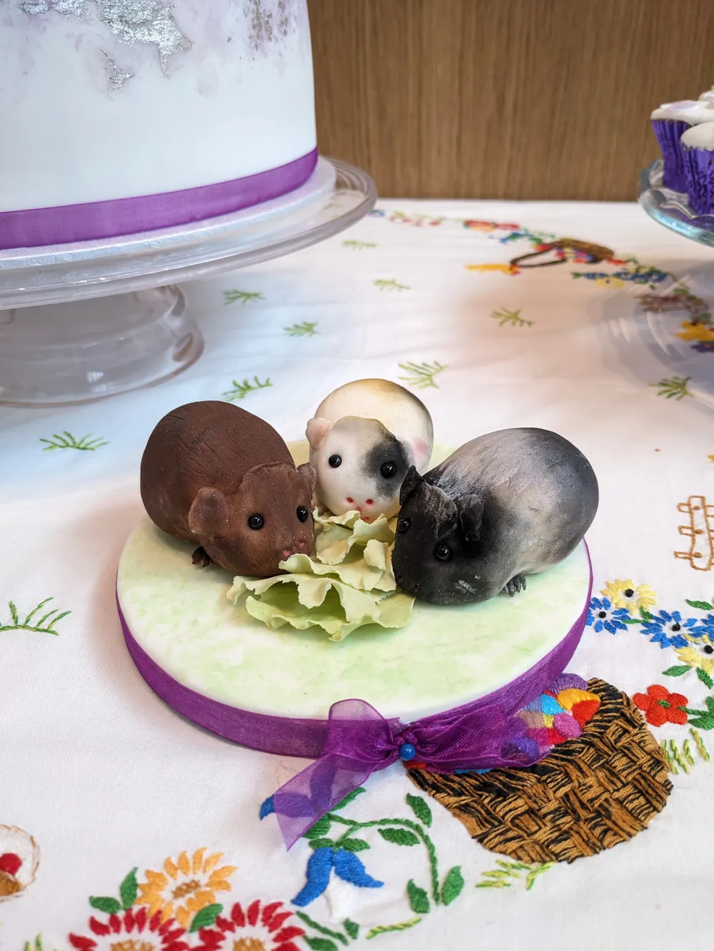The cake, vegan cupcakes and fondant guinea pigs